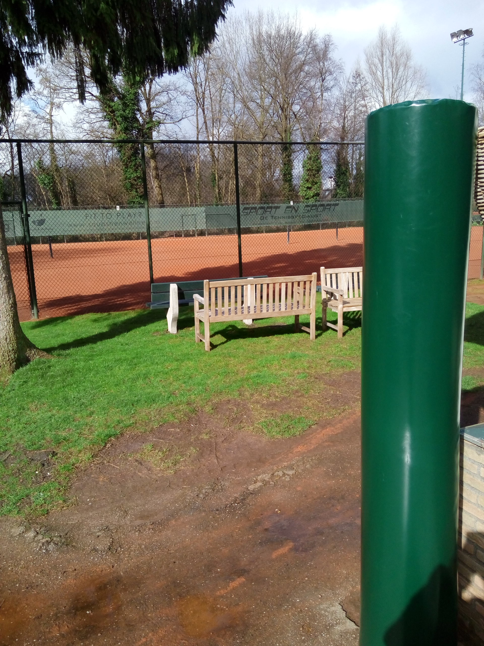 Voor een aantal lichtmasten heeft de Tennisvereniging Het Spieghel gekozen voor tennis groene paalhoezen.