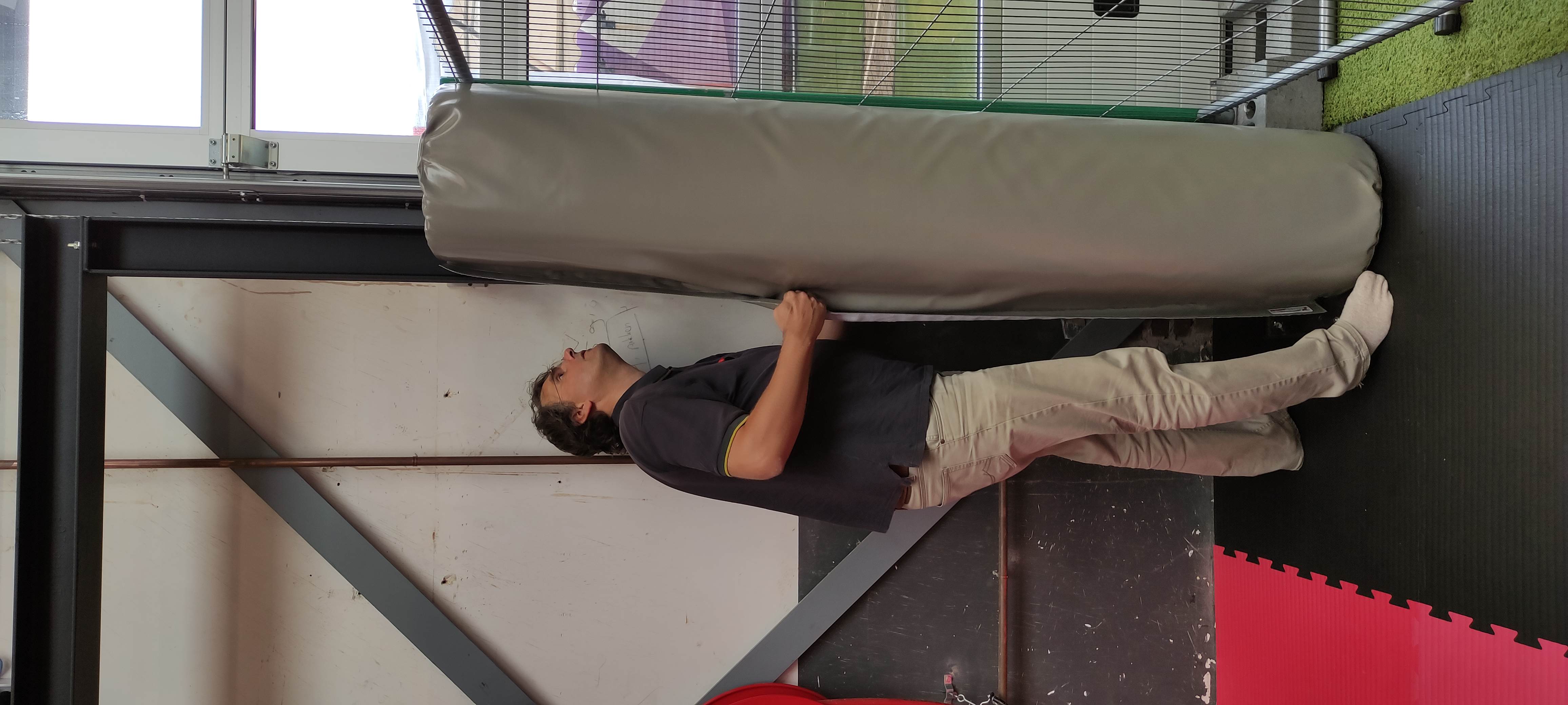 De zijkant van deze trap heeft Sportkussens.nl (onderdeel van Marcapelli Protect) voorzien van een 5 cm dik beschermkussen, gemaakt in dezelfde kleur als de beschermhoezen om de stalen pilaren
