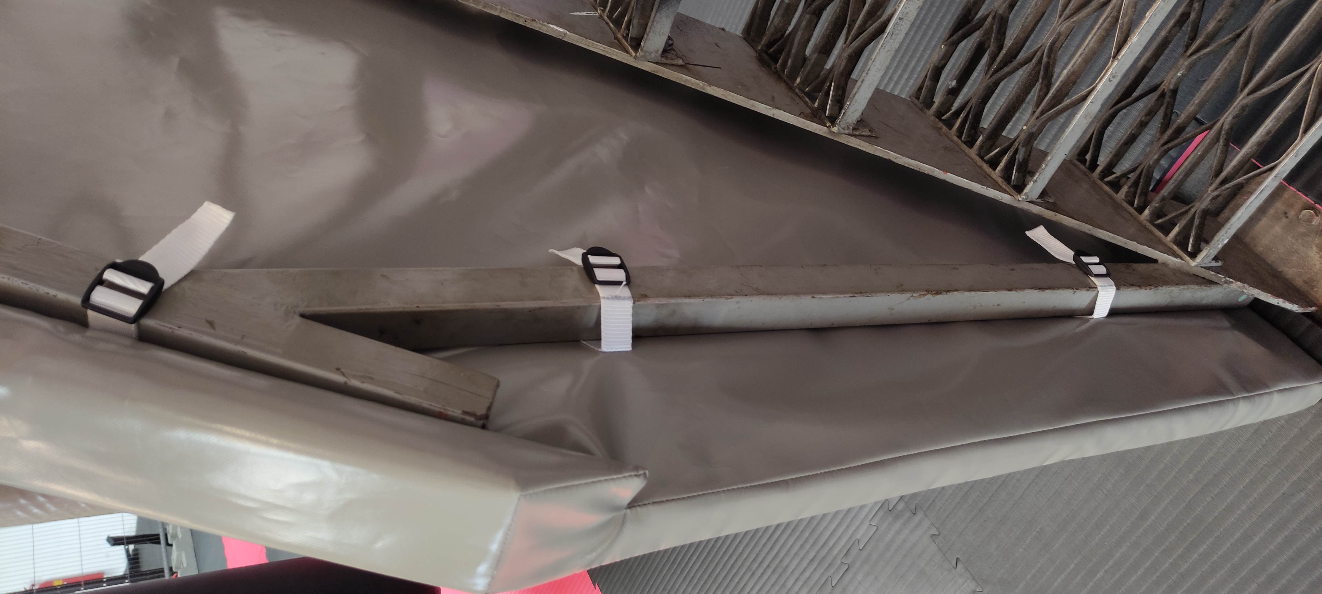 Dit beschermkussen is geheel op maat gemaakt en met nylon riem en kunststof gesp aan de trap gemonteerd.